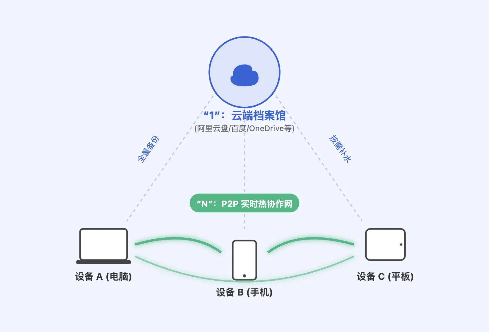 1+N 架构 是 Sync Vault 独创的分布式同步模型,旨在打破同步速度、存储空间与数据隐私之间的“不可能三角”。 - “1” (云端中心):用户的第三方网盘(阿里云盘、百度网盘、OneDrive、夸克网盘 等)。作为 冷数据中心,负责海量(TB级)数据的长久备份。 - “N” (热节点):用户的终端设备(电脑、手机、平板)。作为 热协作节点,通过 P2P 协议组成实时通信网。