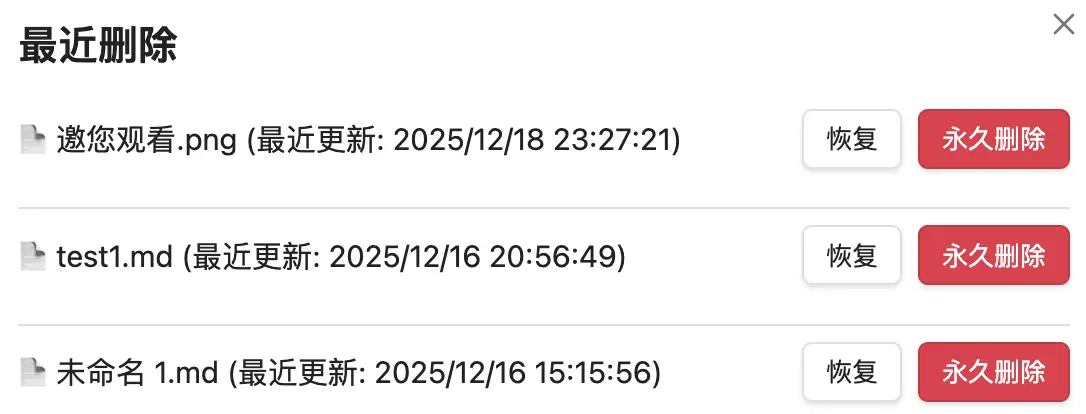 用户也可以在如下路径:.obsidian/plugins/sync vault插件目录/.data/.trash 找到被删的文件,文件会自动保留被删除时的目录结构,因此可以直接将文件夹拷贝回去。