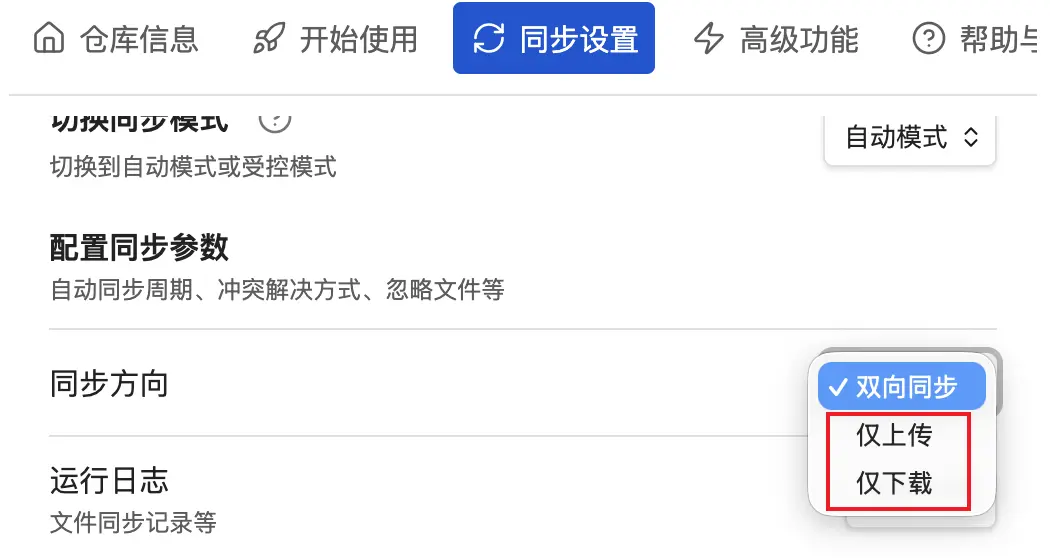 开启单向同步,仅上传或者仅下载后,元数据改动不会被应用到本地和远程,只会触发文件的上传和下载。
